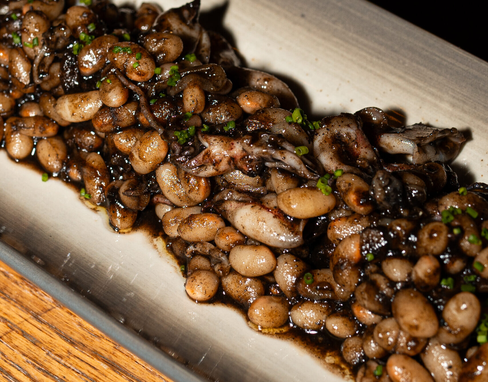 Apostar por un plato blanco o de cerámica artesanal que realce los tonos del glaseado. Los chipirones deben reposar sobre las judías, dejando entrever el brillo de la salsa. Un acabado con gotas de AOVE alrededor y un toque generoso de cebollino crea una presentación elegante y natural.